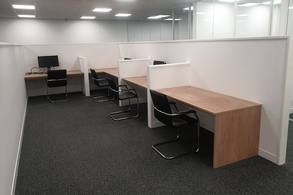 Installed in the central office area were purpose-made desk units supported on the new freestanding partition walls. Constructed using a 25mm thick oak veneered chipboard, these desks matched the other furniture on the floor.