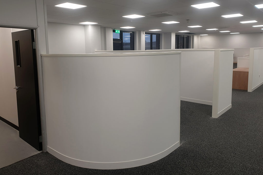 At the entrance to the office, our customer required the first corner of the freestanding partitioning to be curved, which allowed easy access to the general office area, which was formed using special bendable plasterboard on a well-designed metal stud framework.
