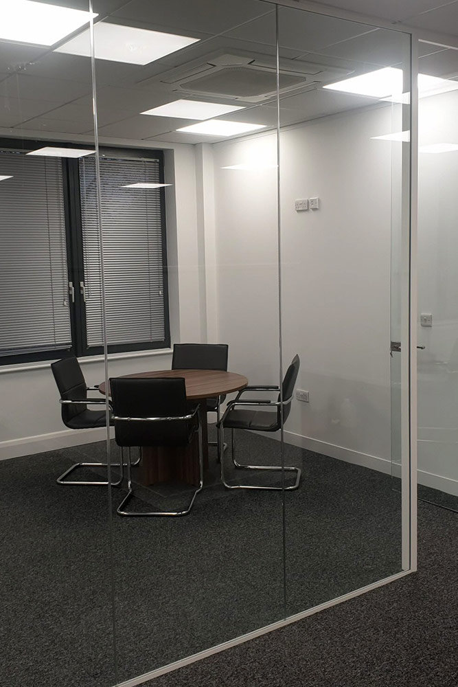 The glass walls constructed using 12mm thick, toughened clear glass, held in position using a 25mm aluminium channel and glass doors allowed the natural light from the outside window to flood throughout the central area and aesthetically created a very modern feel within the office.