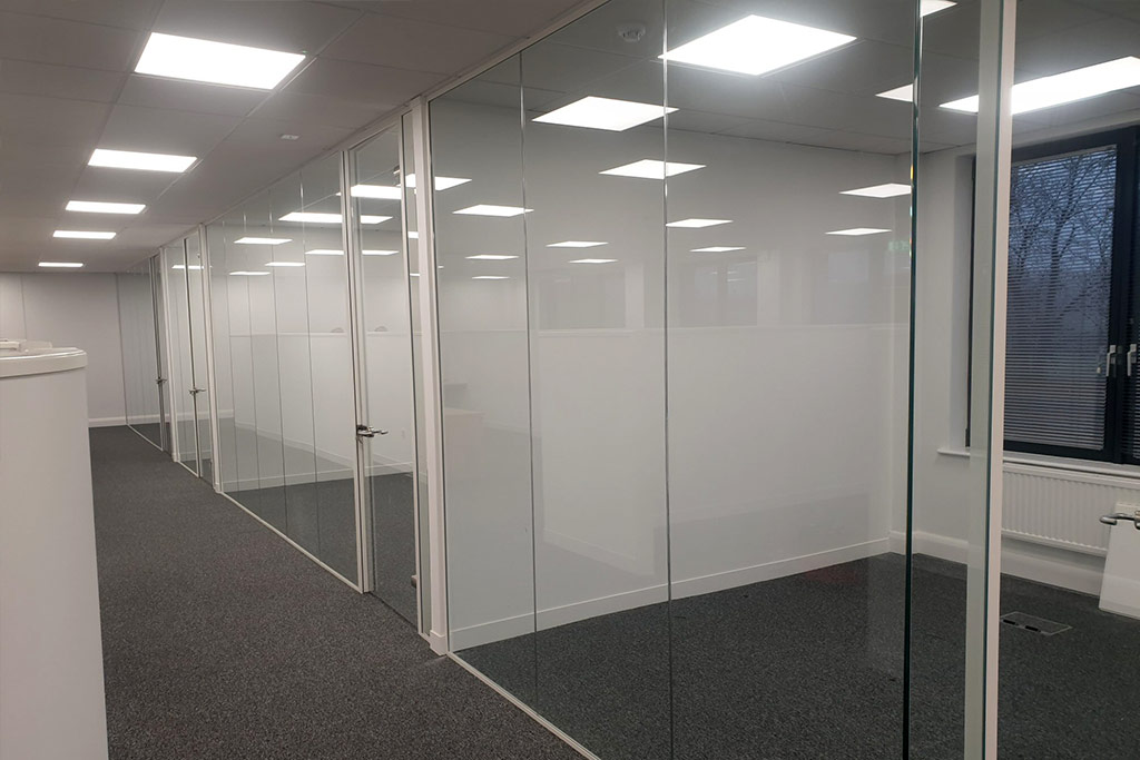Office accommodation on the first floor consisted of four executive offices constructed using solid metal stud and plasterboard, forming the dividing walls from the Komfort Komfire 100 range. Frameless Glass partitioning created the front of the offices and included four full-height glass doors.